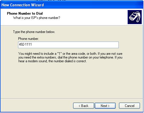 Type the dial up phone number that you wish to dial and choose next.