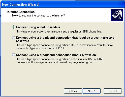 - Choose Connect using a dial-up modem and choose next.